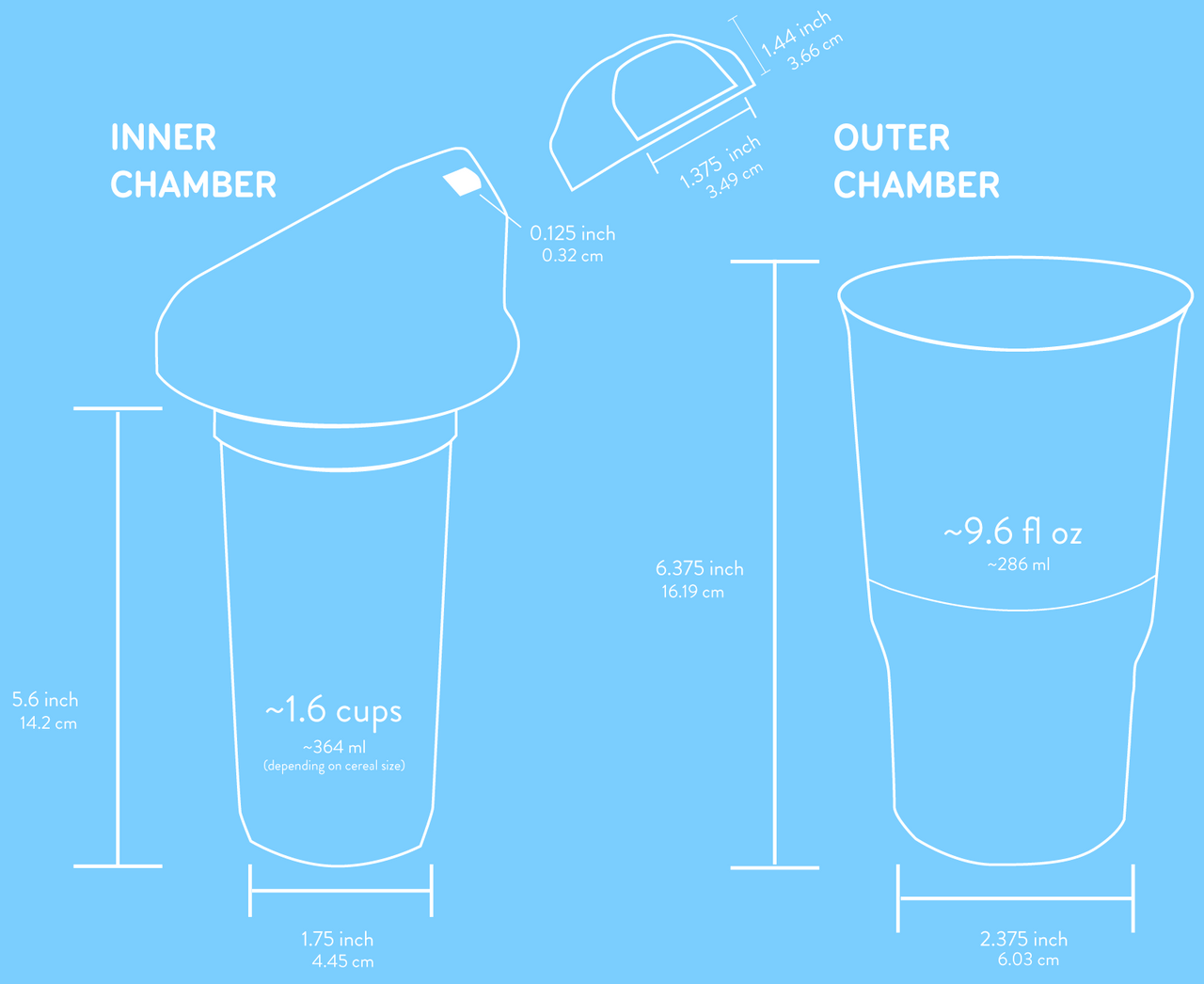Say goodbye to soggy cereal, The CrunchCup® keeps your cereal crunchy. Simply add cereal to the inner cup, milk into the outer cup, screw on the lid, and you're ready to crunch. The milk and cereal don't meet until it's time to eat. See How it Works
